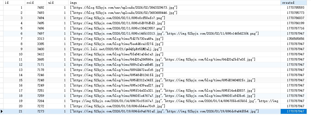Handsome 时光机中的图片地址散落在评论正文里,OneBlog 要求将图片链接单独存入 typecho_memos_img 表,每条图片记录对应一个评论(coid),链接存入 img_json 字段(JSON 数组格式)。