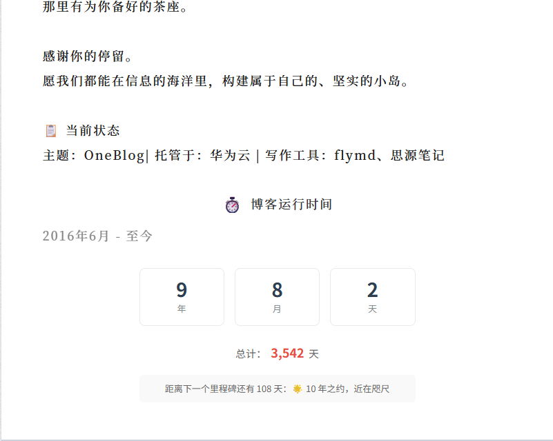 博客运行时间统计:从 2016 年 6 月建站起,自动计算已运行的年/月/天及总天数,并以进度条形式展示距离 10 年的目标进度。