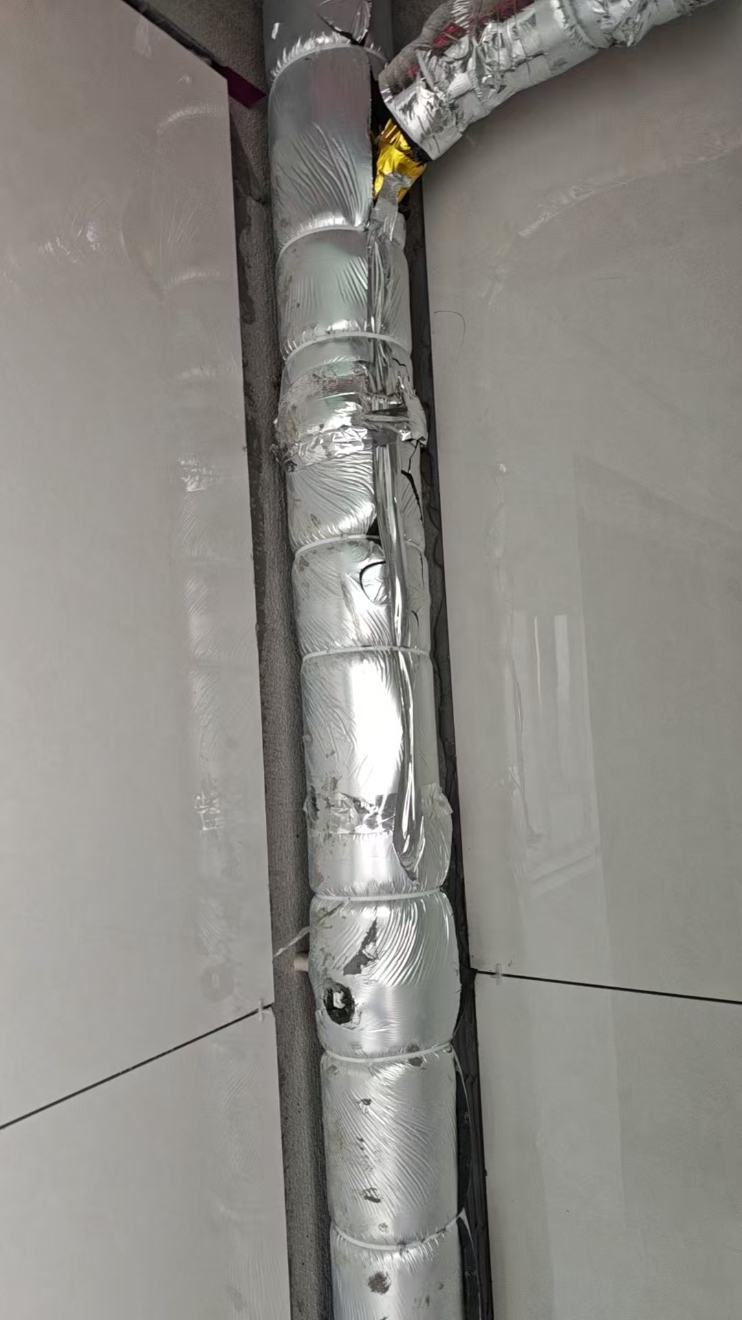 开发商预留的位置在下水管和墙壁之间。不包隔音棉、阳台不贴砖的话,空间完全够用。但一贴砖、包了隔音棉,就只剩3公分左右。提前没打洞,后面想穿管子就难了。只能另想办法。