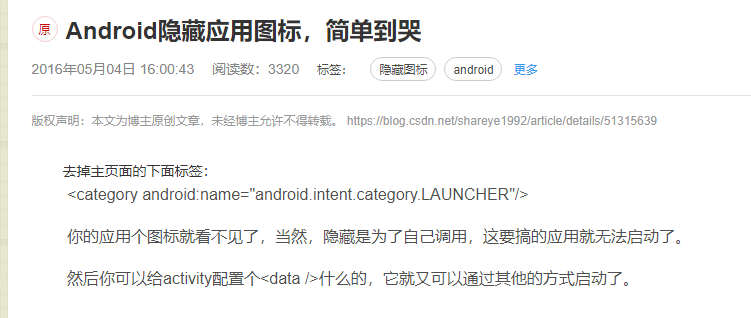 参考上图就可以找到这句代码,删除之,保存之,编译,ok,你的软件图标就不会在手机桌面展示出来了,需要打开这个程序可以用其他程序调起