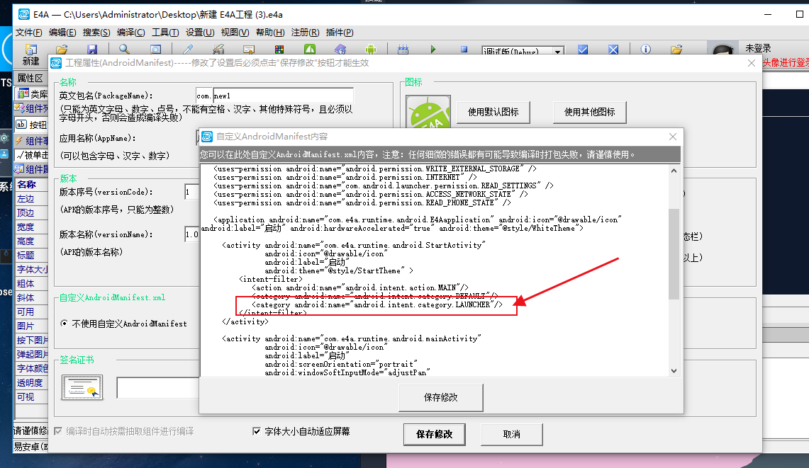 这个就是AndroidManifest.xml文件,在E4A里面这个东西可以自定义: