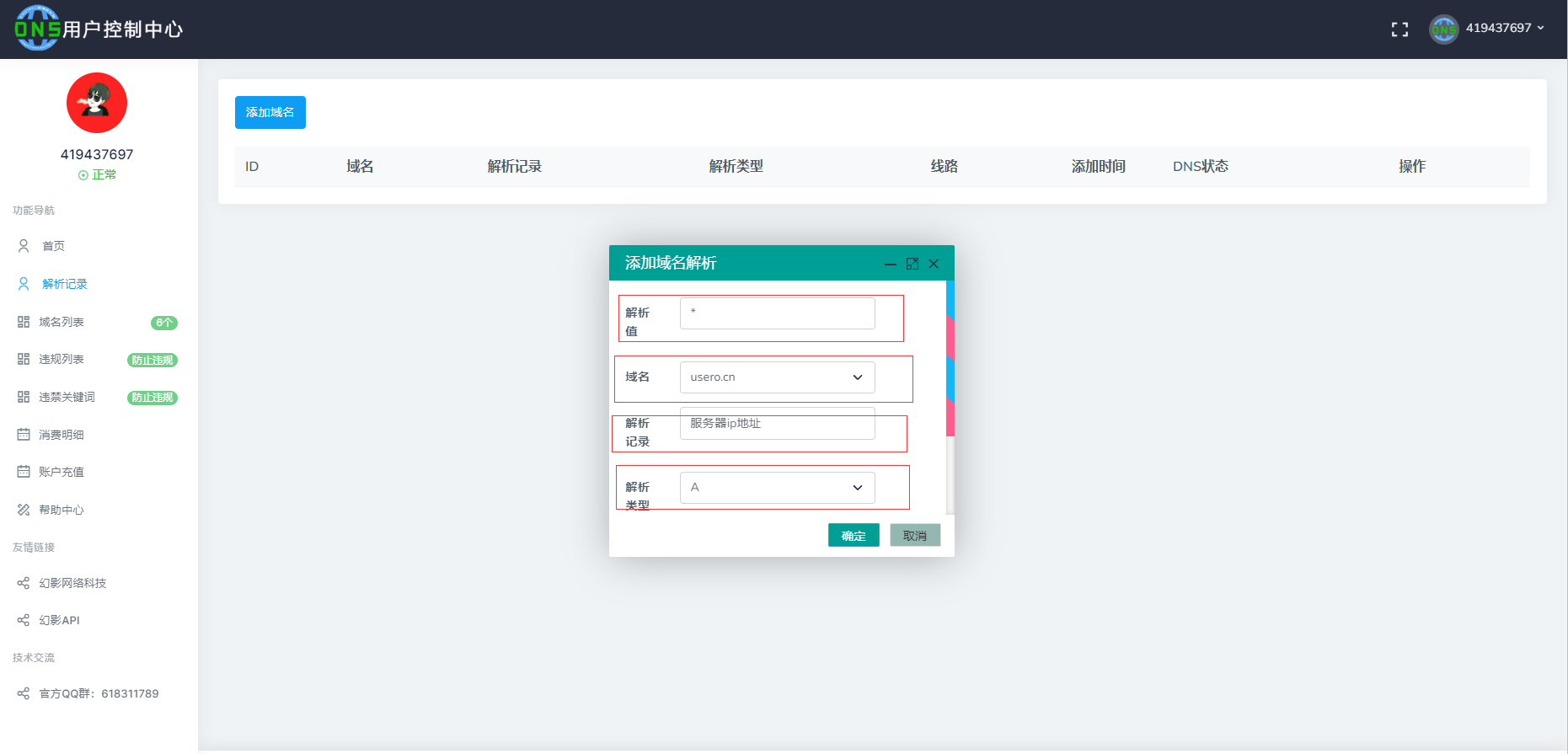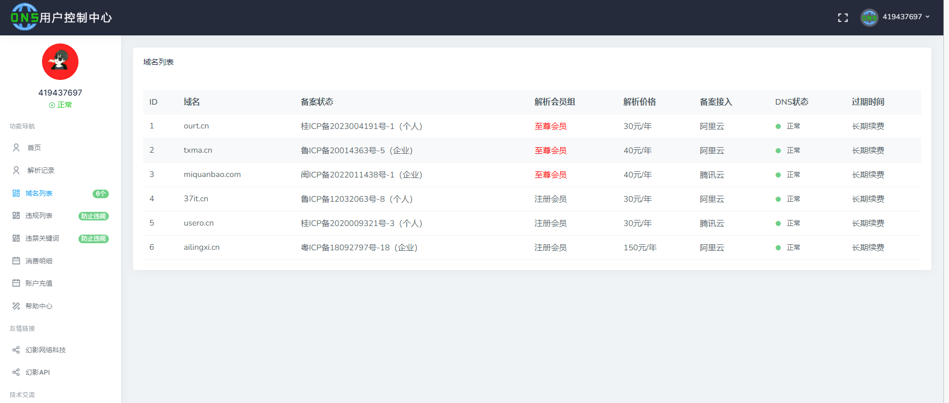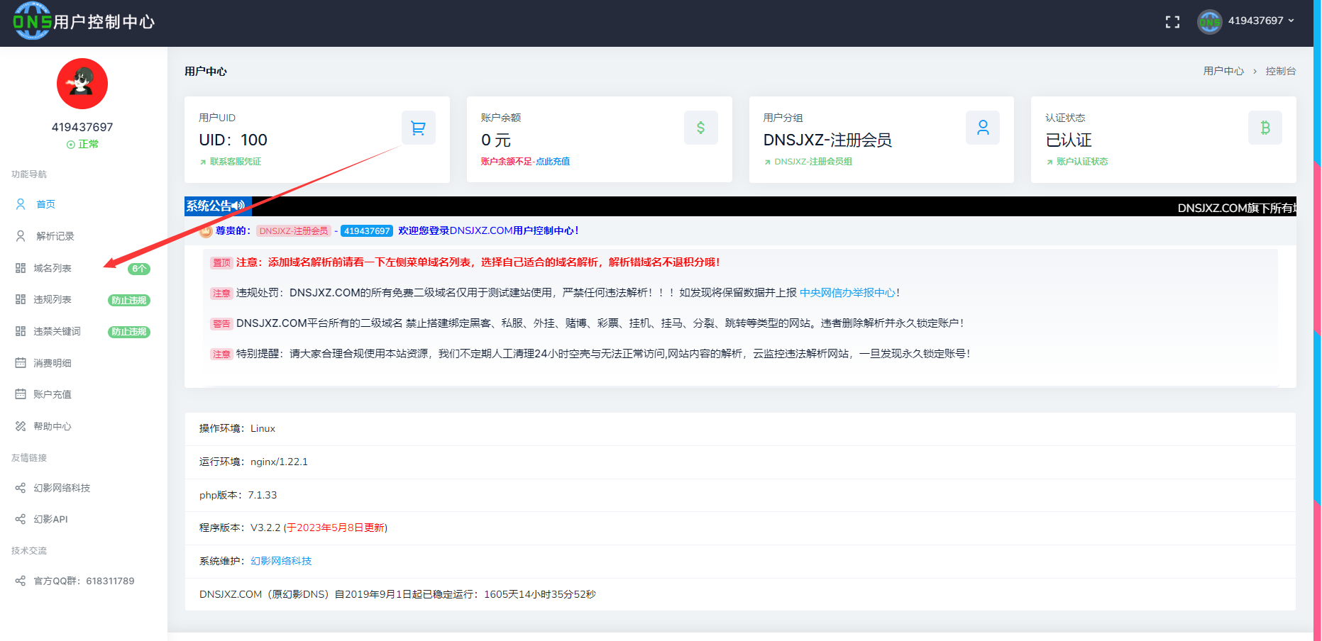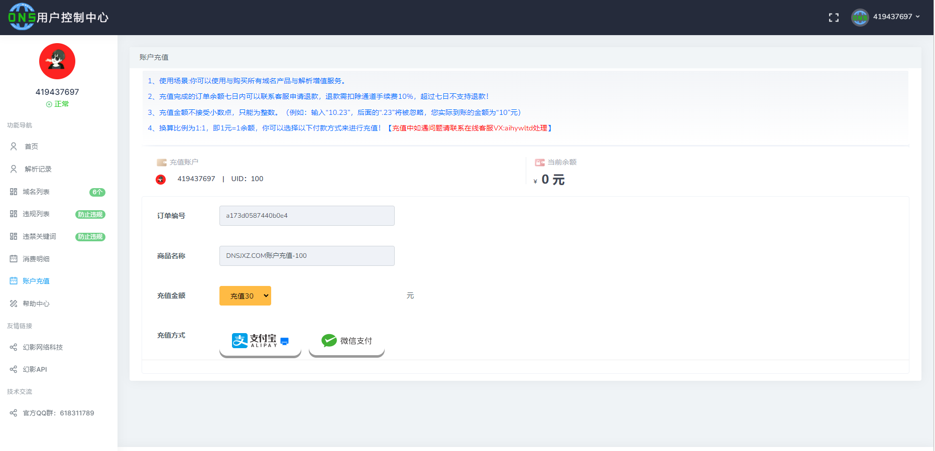 2.确定使用的域名后可点击《账户充值》充值余额进行解析 充值你所解析域名的价格