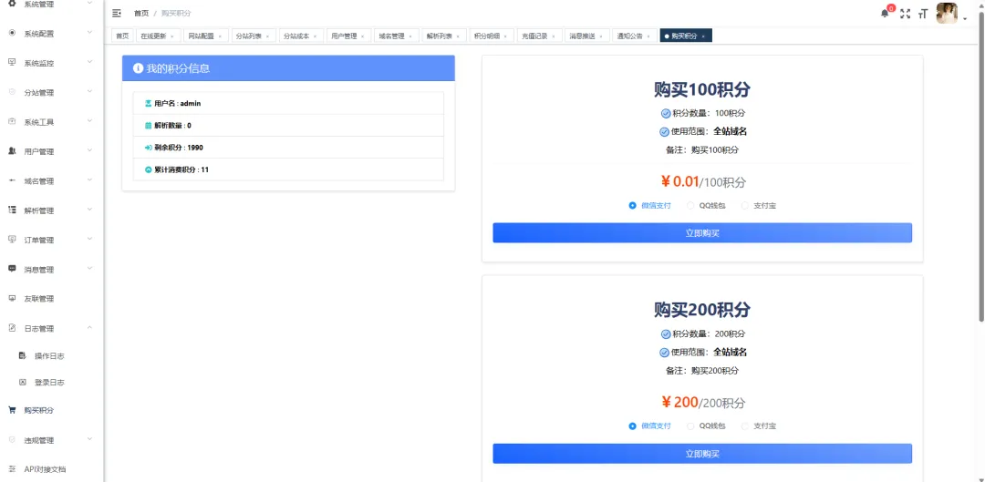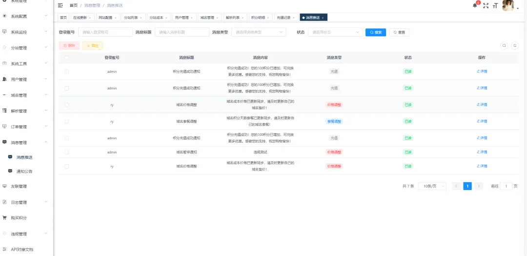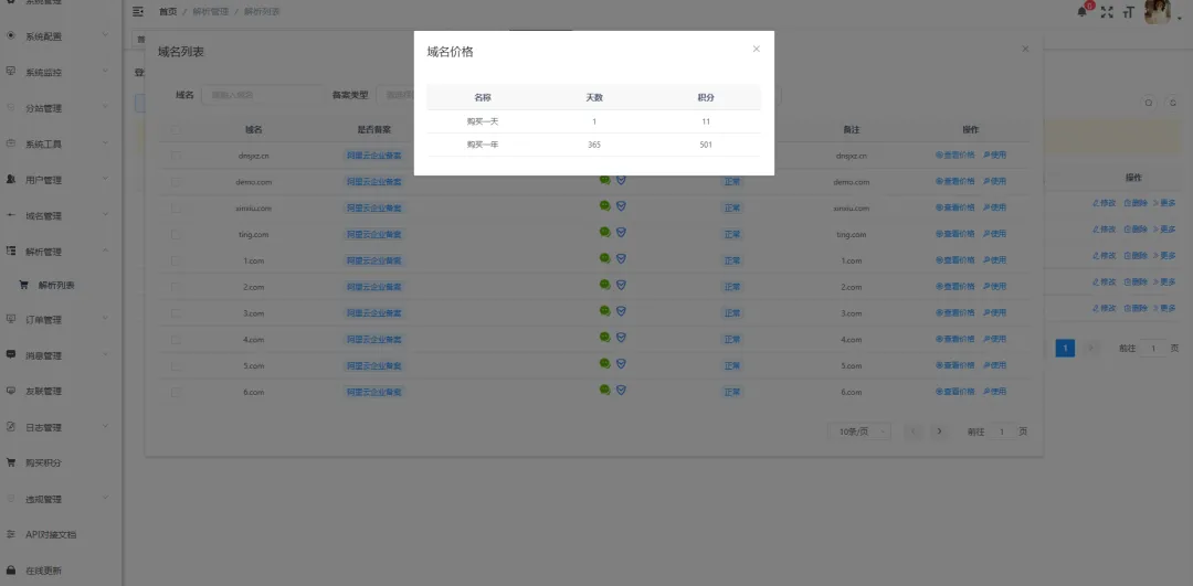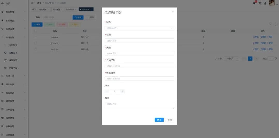 • 分站提成/成本控制:主站可一键设置所有站点域名成本价格,然后一键同步至所有分站中,分站消费后可在提成明细中查看