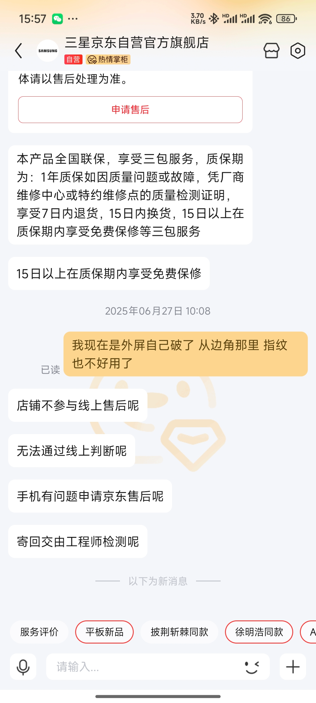 我发誓,我真的没有摔它、没有压它,它就这么安静地、毫无征兆地碎了。当时的心情,只能用“懵逼”二字形容。赶紧咨询京东官方售后,得到的答复是:人为损坏,不在保修范围内,换屏费用1200+。
