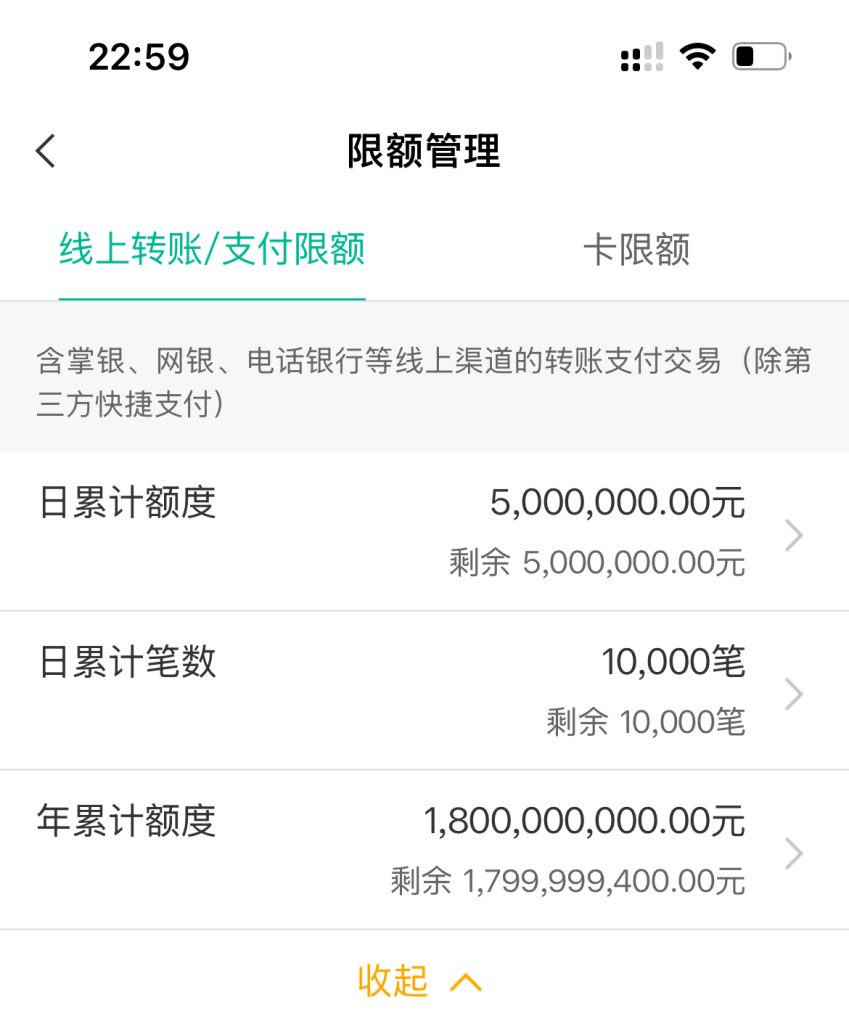 年限额18亿 日限额500W 的用户5000块钱转不走?最近一直把钱提到某农业银行存着,今天手上的钱不够,想着拿银行卡里面的用用,第一笔付款6800 显示...